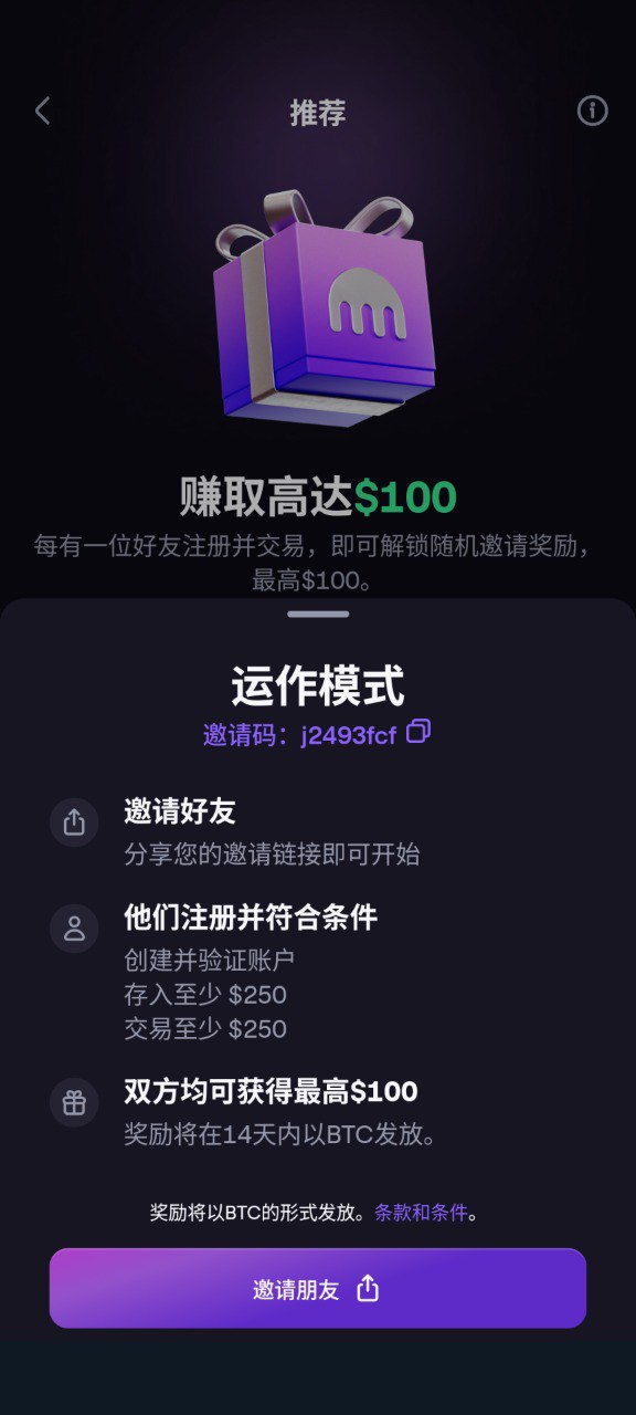 - 奖励条件:入金 250美元(需按规定方式入金)并交易250美元交易量大概2u手续费,(买卖来回双向都算交易,)新开有试用一个月会员开完就取消订阅还可用一个月,推荐交易BTC/usd现货,完成后 14 天内发放25- 100 美元BTC 奖励