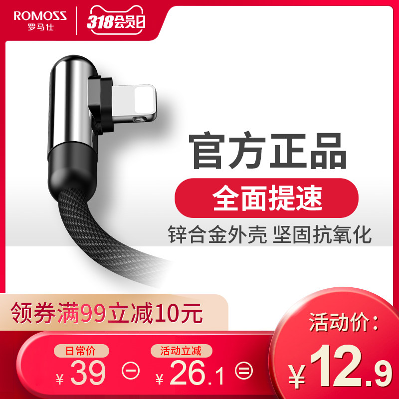 【商品名称】:罗马仕 iphonex数据线苹果6s加长5S闪充8P手机7Plus充电线8X器弯头快充iPhone6平板se闪充适用ipad短XS Max