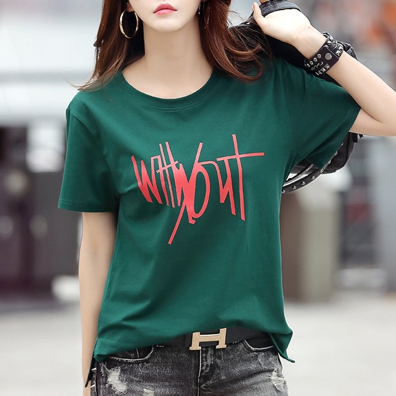 【商品】:纯棉字母印花t恤女2021夏新款宽松百搭大码胖mm时尚洋气上衣ins潮